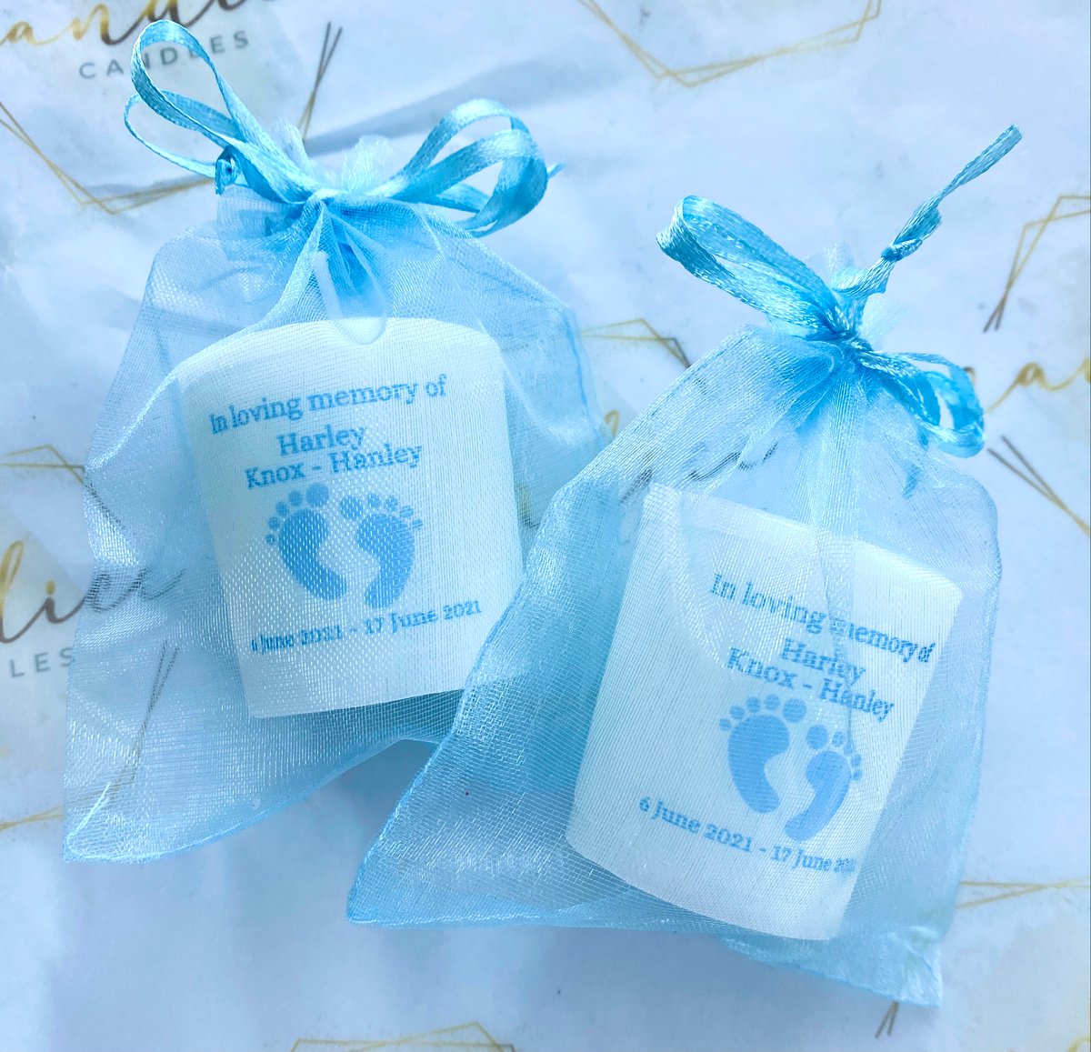 Each candle is hand poured twice over and once the wax is set, your personalised design is applied to each candle , wicks inserted into the candles and placed into the lush colourful organza bags.